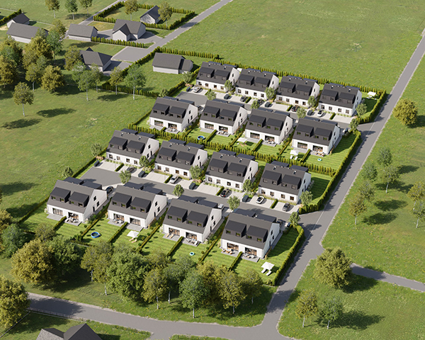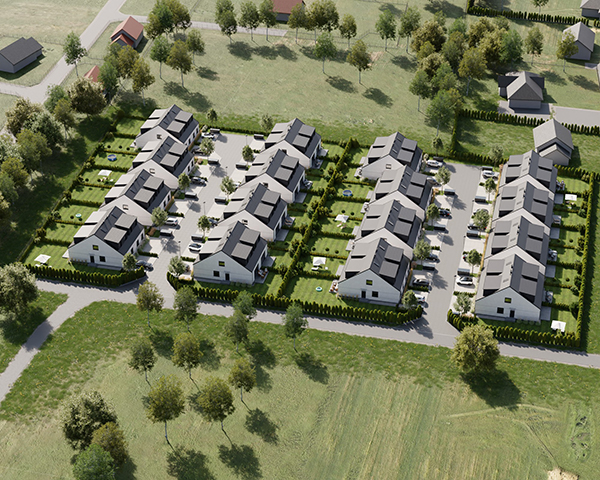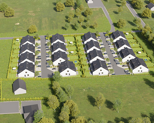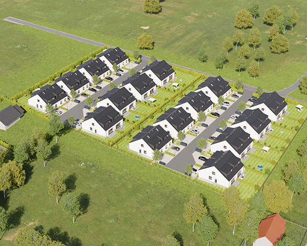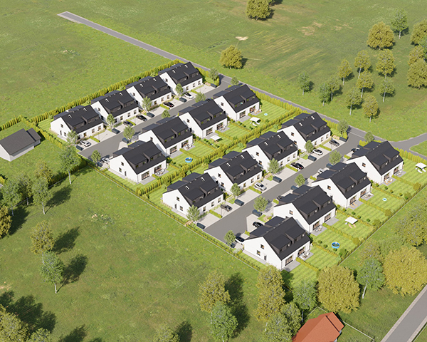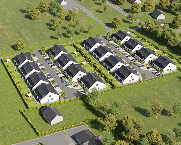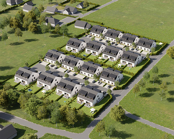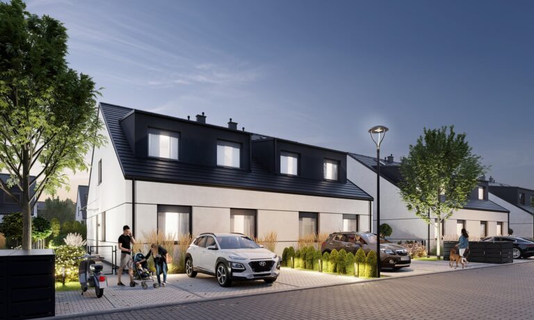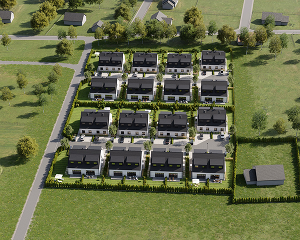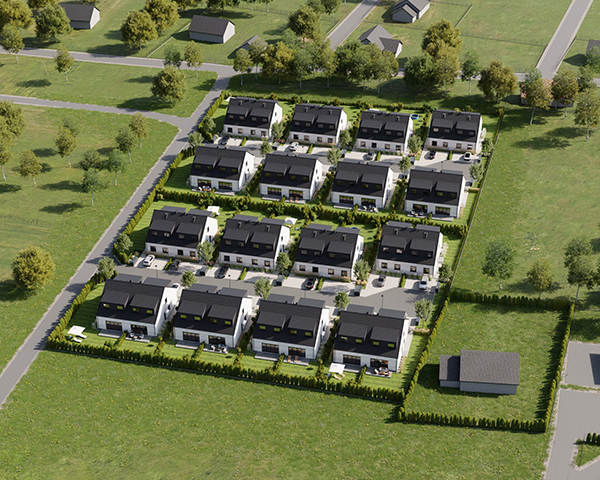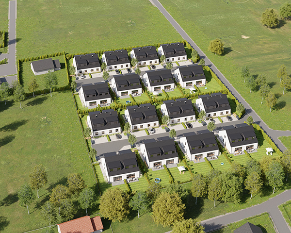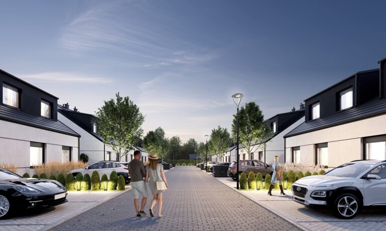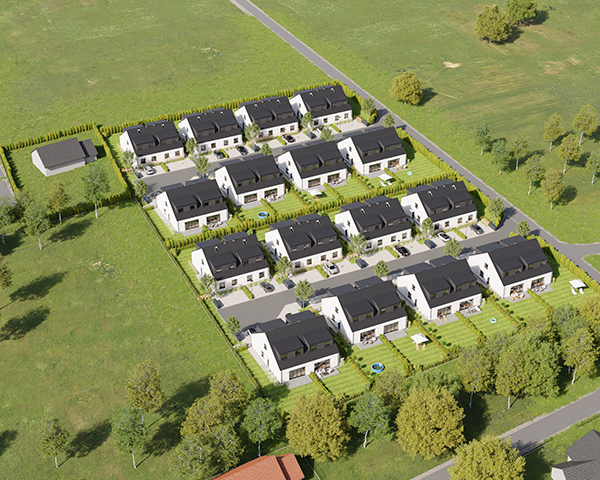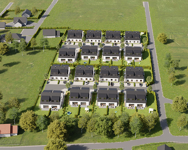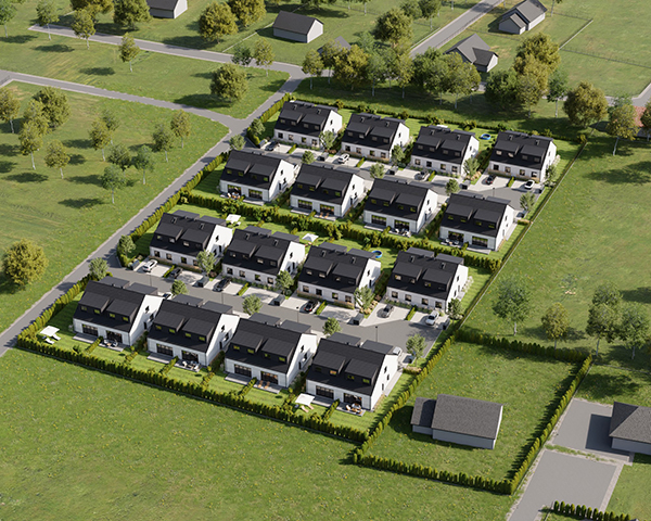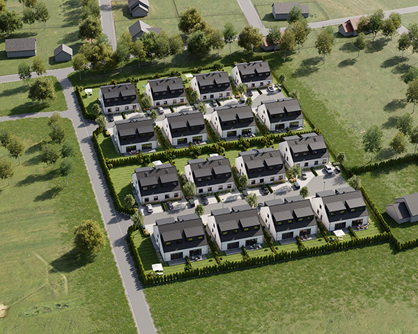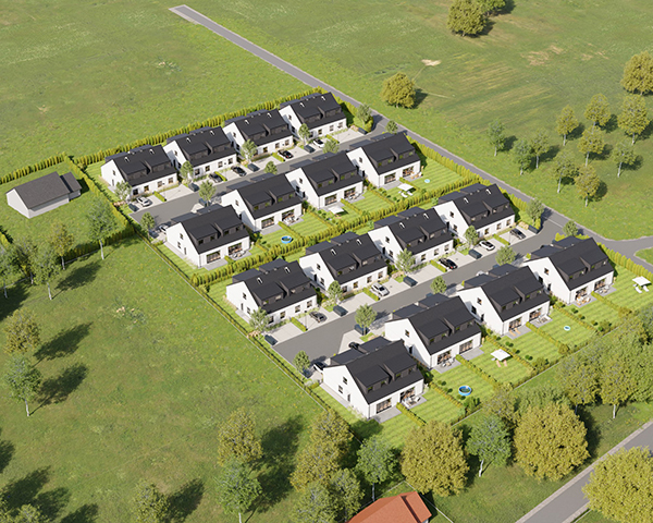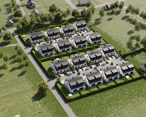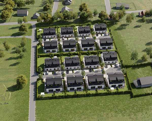 Zobacz w Google MapsOsiedle Skandynawskie w Pisarzowicach to nowoczesny projekt, obejmujący łącznie 16 domów jednorodzinnych dwulokalowych, usytuowanych na działkach o powierzchni od 285 m² do 528 m². Teren osiedla jest ogrodzony, prywatny i w pełni zagospodarowany – dojazd do posesji odbywa się przez elektryczną bramę wjazdową, utwardzonymi i oświetlonymi drogami wewnętrznymi. Do każdego domu przypisane są dwa lub trzy miejsca postojowe.