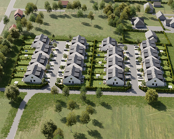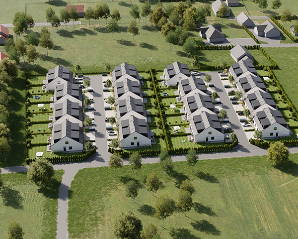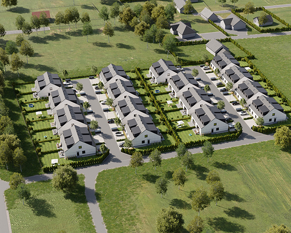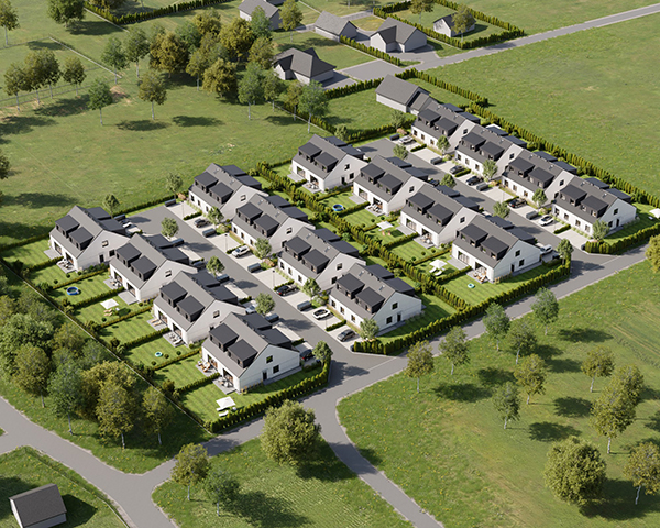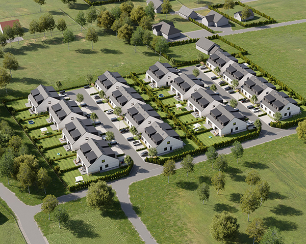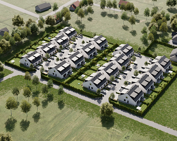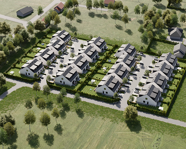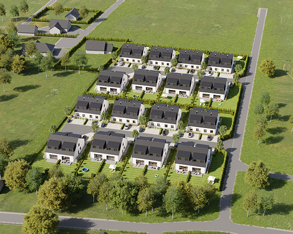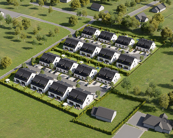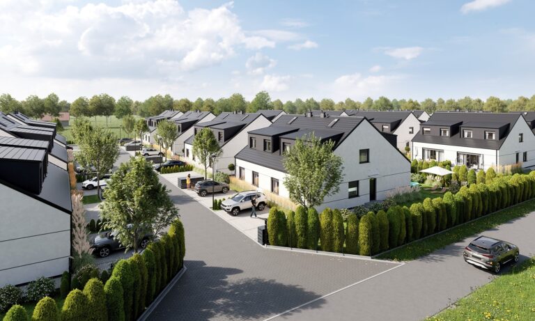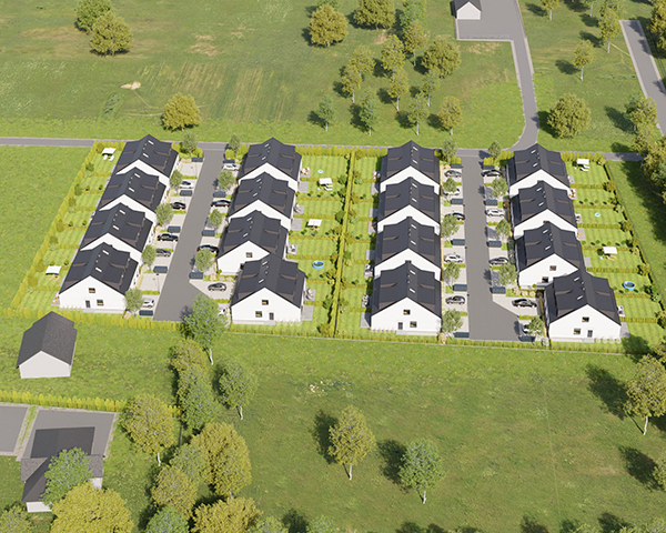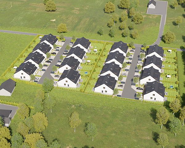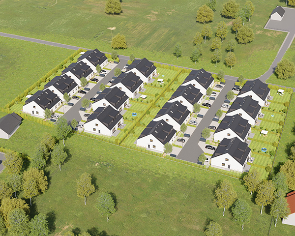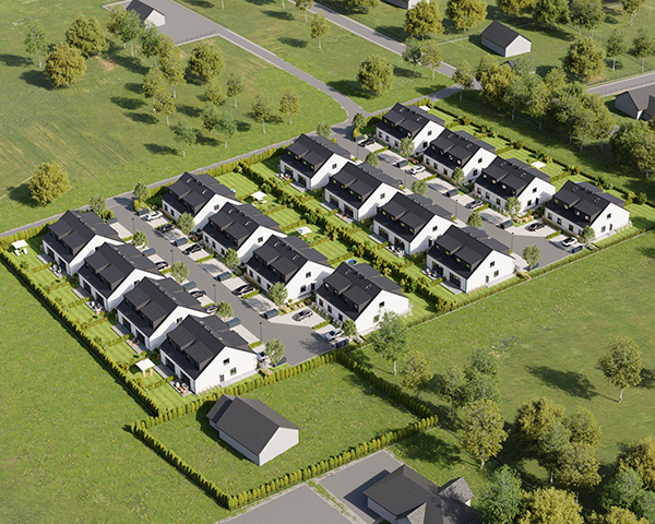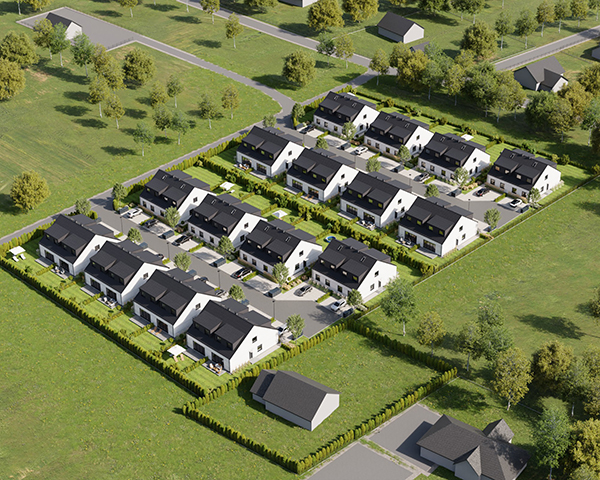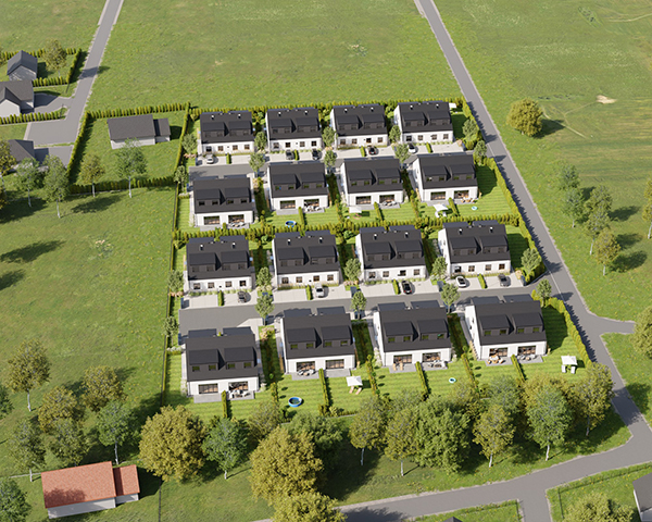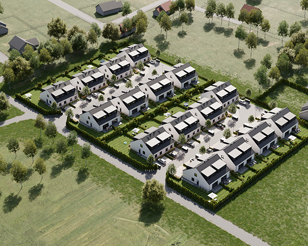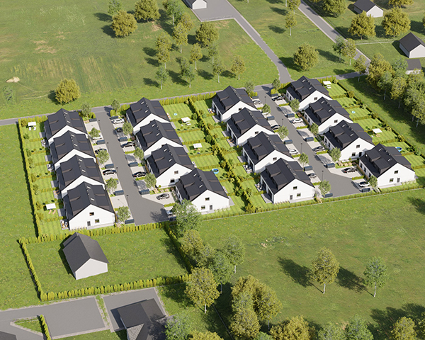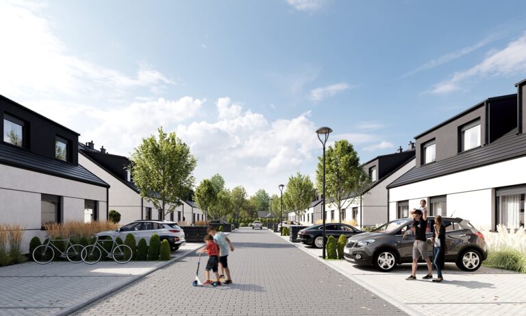 Zobacz w Google MapsOsiedle Skandynawskie w Pisarzowicach to nowoczesny projekt, obejmujący łącznie 16 domów jednorodzinnych dwulokalowych, usytuowanych na działkach o powierzchni od 285 m² do 528 m². Teren osiedla jest ogrodzony, prywatny i w pełni zagospodarowany – dojazd do posesji odbywa się przez elektryczną bramę wjazdową, utwardzonymi i oświetlonymi drogami wewnętrznymi. Do każdego domu przypisane są dwa lub trzy miejsca postojowe.